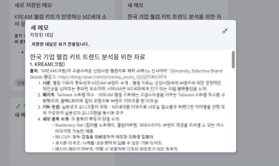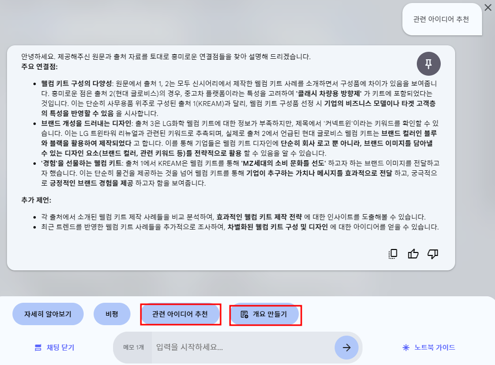 "관련 아이디어 추천" 버튼을 클릭하면, 단순한 포스팅별 내용 요약본에 불과했던 메모가 다양한 주제와 시각으로 확장되는데요. 브랜드의 특성을 반영한 구성품의 다양성이나, 긍정적인 브랜드 '경험'을 위한 웰컴키트 메시지 전달 방법 등 자동으로 웰컴키트에 대한 다양한 주제로 내용이 확장되는 것을 볼 수 있습니다. 해당 기능도 아이디어 구체화 단계에서 유용하게 잘 사용한 기능입니다.
