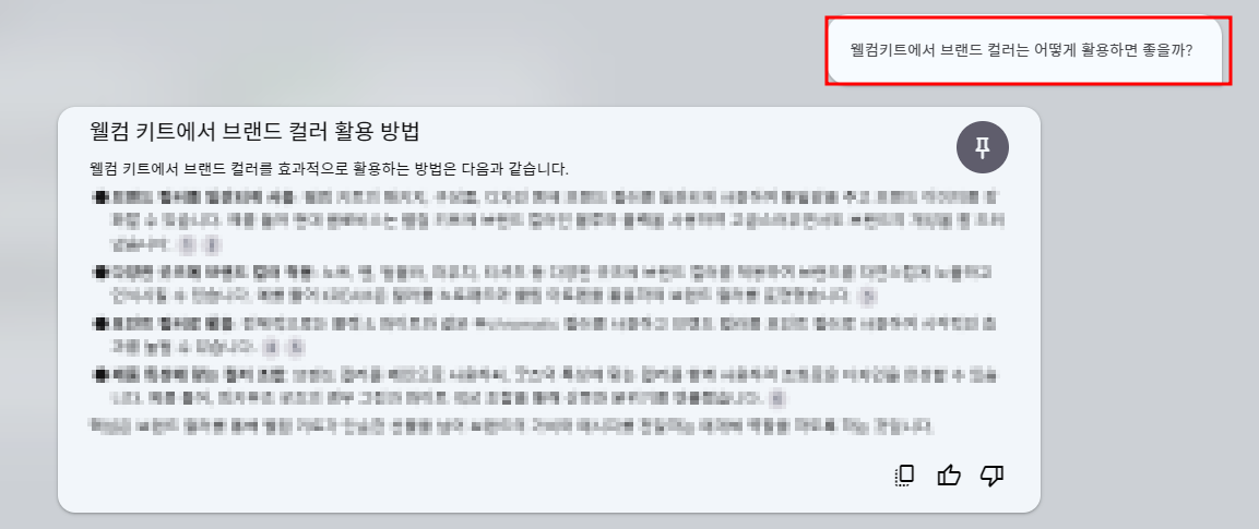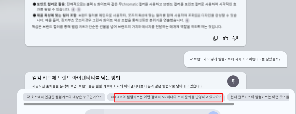 결국 웰컴키트는 단순히 그럴싸해 보이는 굿즈가 아니라 우리 브랜드와 받는 사람 사이의 관계를 만드는 역할을 수행해야 함을 깨달았는데요. 이처럼 노트북LM의 자동 생성되는 질문은 제가 미처 생각지 못했던 웰컴키트 제작에 대한 본질적인 문제를 깊이 있게 짚어주어 기획의 깊이감을 더해주는 역할을 한다는 데 매우 유용했습니다.