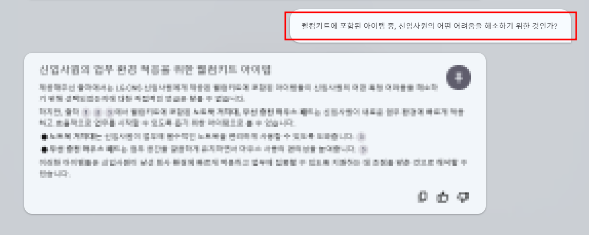 특히 "웰컴키트에 포함된 아이템이 신입사원의 어떠한 어려움을 해소하기 위한 것인가?"라는 질문이 자동 생성되어 관련 내용들을 세부적으로 확장해볼 수 있었는데요. 이는 제게 웰컴키트가 단순히 유용한 품목을 담는 것을 넘어, 받는 사람의 실제 필요와 문제를 해결하는 데 중점을 두어야 한다는 인사이트를 주었습니다.