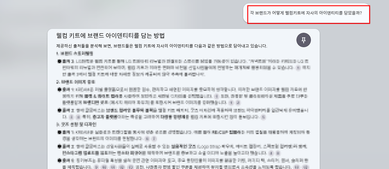 브랜드별로 포인트 컬러를 어떤 방식으로 키트 패키지에 녹여내었는지, 각 제품의 특성에 맞는 컬러 조합을 어떻게 활용했는지, 그리고 브랜드 아이덴티티를 키트에 담아내기 위해 스토리텔링은 어떠한 방식으로 풀어내었는지 등 각 출처의 정보를 반영하여 각 질문에 맞는 답변을 체계적으로 생성해 줍니다.
