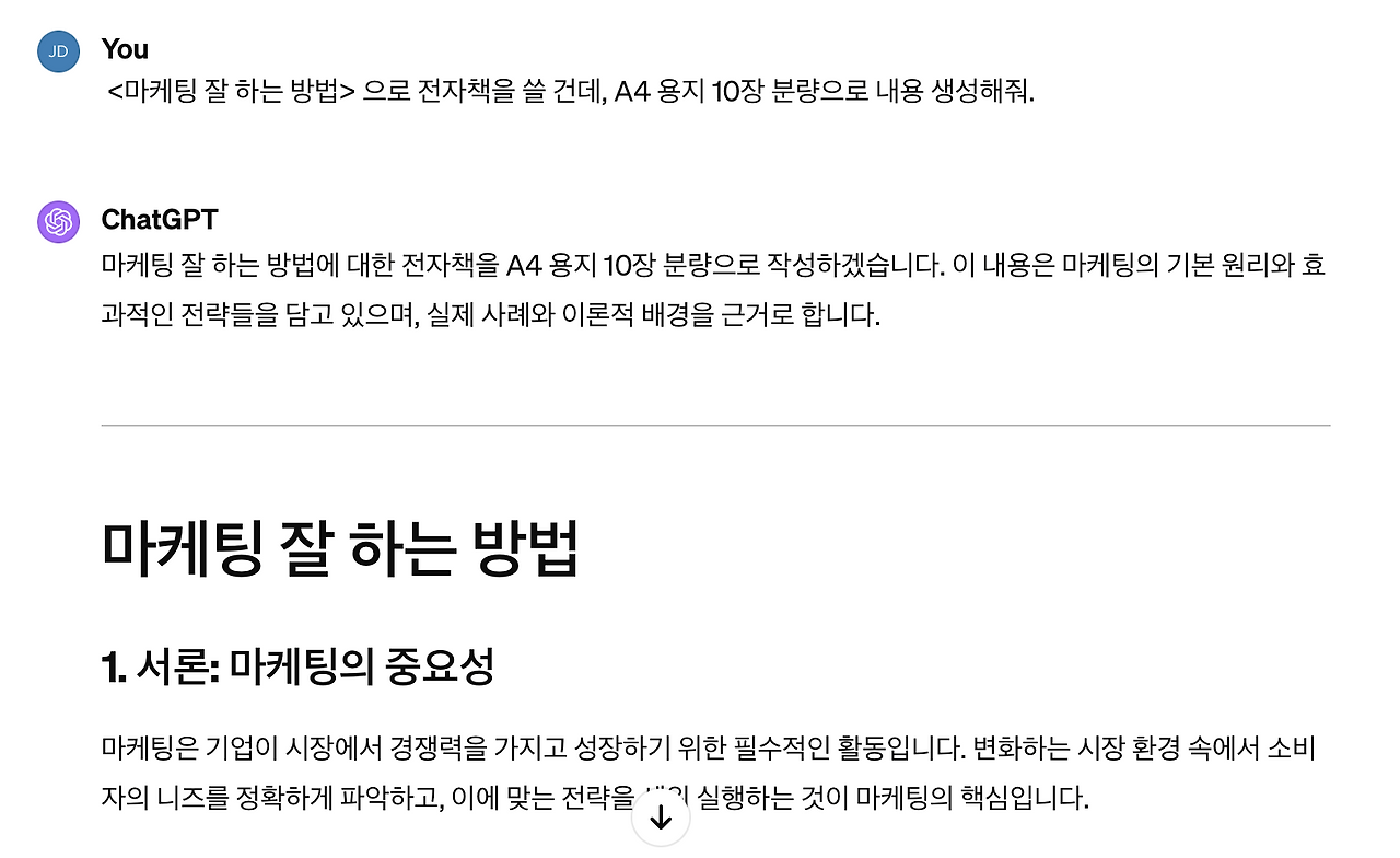 예를 들어, 챗GPT에 '<마케팅 잘하는 방법>이라는 제목의 전자책 A4용지 10장 분량으로 생성해 줘.'라는 프롬프트를 입력하여 조금의 수정 작업을 거치기만 하면, 두 시간도 안 되어 전자책이 완성된다.