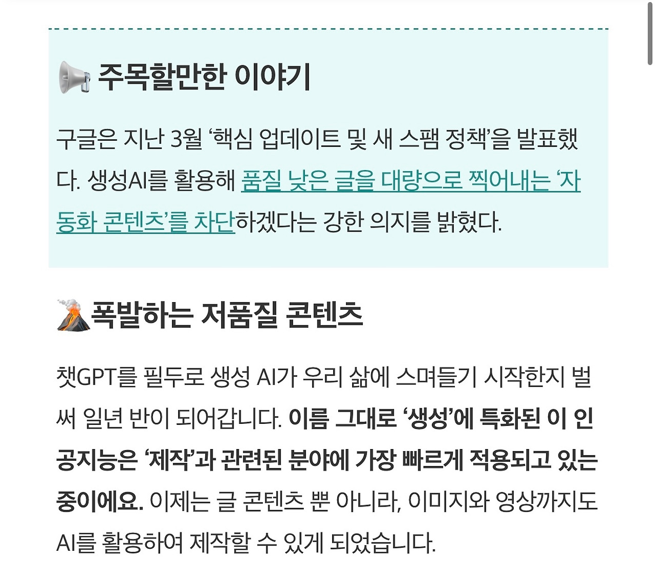 하지만 최근, 'AI 활용하여 어색하지 않은 글 작성하는 방법', 'AI 활용으로도 저품질 콘텐츠가 되지 않는 법' 등 단순 방법론적 측면에서 나아가, AI를 활용하면서도 그 퀄리티를 높일 수 있는 방법이나, 나만의 차별화된 콘텐츠를 만들어야 한다는 주제로 흐름이 바뀌고 있다.