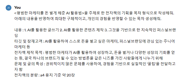 따라서, 프롬프트는 구체적이어야 한다. 전자책 주제, 제작 목적, 잠재고객 특성, 문체, 분량 등 최대한 상세하게 지시하는 게 중요하다.