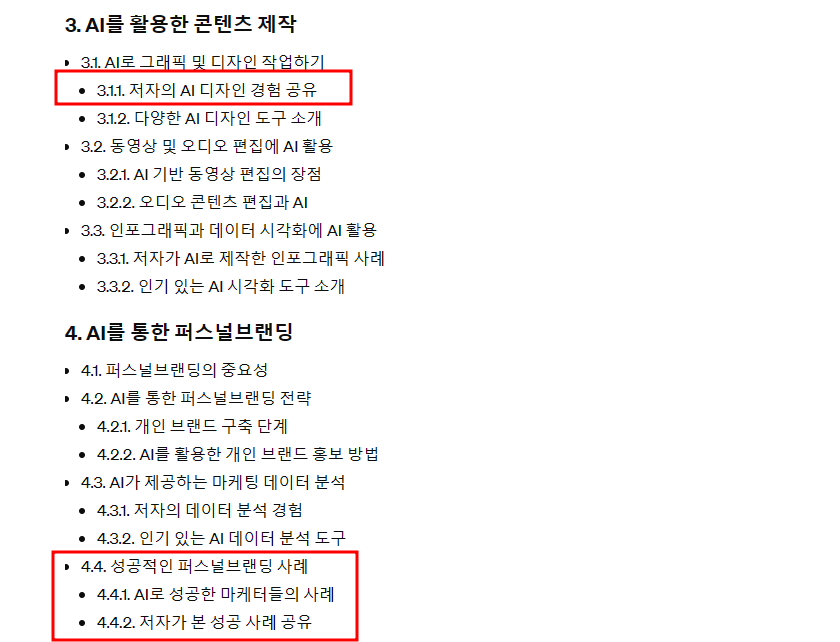이처럼, 구체적인 프롬프트로 지시하여, 연쇄적인 질문으로 디테일을 보완해 나가는 과정을 통해 전자책 제작은 물론이고 정보 전달 목적의 자료를 작성하는 데 있어, 전문성과 완성도 높은 기획을 그려갈 수 있다.