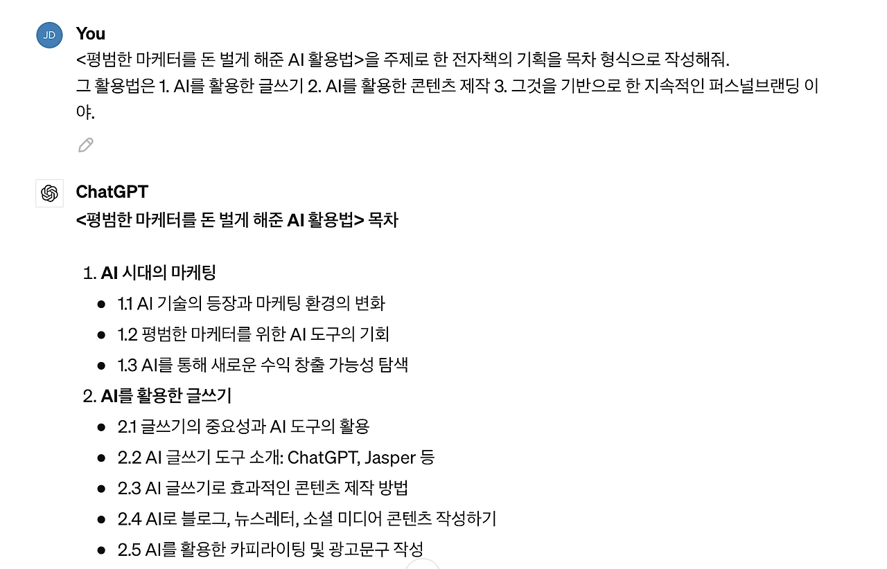 <평범한 마케터를 돈 벌게 해 준 AI 활용법>이라는 주제로 전자책의 기획을 목차 형태로 생성해 보았다. 프롬프트 입력만으로, 한 편의 전자책을 완성할 수 있을 만한 목차가 생성되었다. 하지만 '콘텐츠 유형과 AI 활용법', '퍼스널 브랜딩의 중요성과 AI의 역할' 매우 일반적인 주제들로 구성되어 있다. 당연한 사실이지만, 간단한 프롬프트는 제한된 정보만 제공하기 때문에, 생성된 내용도 대체로 추상적이고 원론적이다.