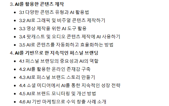 또한, AI로 좋은 기획안을 작성하기 위한 프롬프트는 집요하게 파고드는 질문 능력이 필요하다. 예를 들어, 1차로 생성된 목차를 바탕으로, "AI를 통한 성공적인 퍼스널브랜딩 사례를 주니어 마케터들에게 효과적으로 전달하기 위해서 어떤 소주제로 풀어내야 할지"와 같이 꼬리를 물어 질문할 수 있다. 이러한 연쇄적인 질문은 기획안의 디테일을 보완하는 데 도움이 된다.