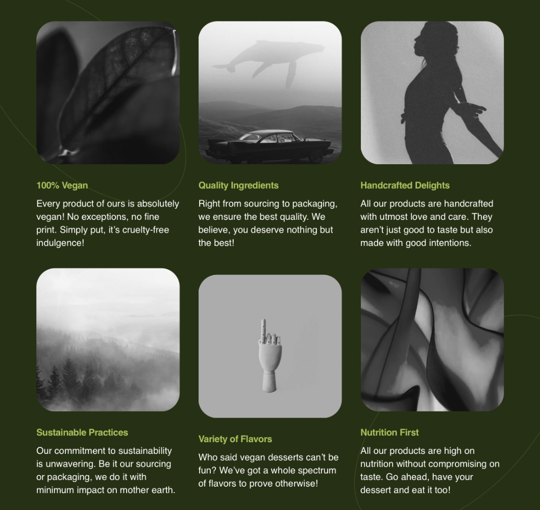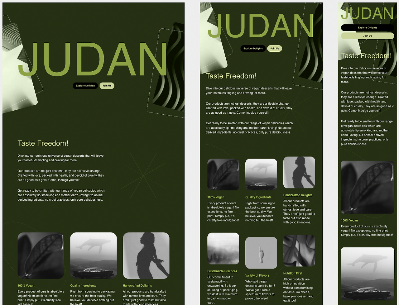 프레이머에 "비건 디저트 브랜드 'JU DAN'의 메인 페이지, 심플하고 현대적인, 이미지가 강조된 레이아웃"이라는 텍스트 프롬프트를 입력했다. 텍스트를 입력하고 생성 버튼을 누르는 것만으로 완성된 형태의 홈페이지가 생성되었다. 특히 우측 이미지를 보면, 레이아웃에 대한 구체적인 설명이나 작업 없이도 '이미지가 강조된 레이아웃'이 효과적으로 구현된 것을 볼 수 있다. 간단한 텍스트 입력만으로 메인 홈페이지가 생성되었으며, 우리 브랜드나 제작 목적에 맞게 디테일을 커스터마즈해 사용하면 된다.