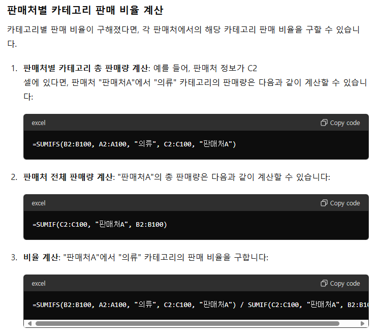 이때, 'A열 - 고객 ID, B열 - 제품명, C열 - 가격' 등과 같이 간단한 엑셀 기본 정보를 챗GPT에 입력하여 적용하고 싶은 함수를 질문하기만 하면 된다. 검색해서 찾아보거나 함수 수식을 시간 내어 외우지 않아도 챗GPT에 프롬프트 입력 한 번이면 위 이미지와 같이 SUMIF, VLOOKUP, IF 함수 등 즉시 복잡한 함수를 도출 가능하다. 복사해서 바로 엑셀에 붙여 넣어 사용하기만 하면 된다. 유료 버전 사용자라면 복사해서 엑셀에 붙여 넣을 필요도 없이 함수가 적용된 파일 형태로 추출하는 것이 가능하다.