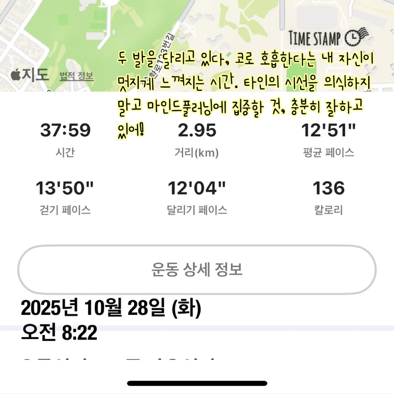 기록을 내거나 마라톤 대회를 참여하는 달리기는 하지 않는다. 고통스럽고 멈추고 싶은 달리기가 절대 아니다. 누군가에게 자랑하거나 보여주기 위한 것도 아니다. 다른 이들과 비교하지 않는다.