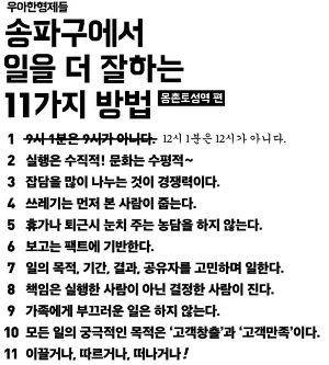 업무의 기본은 성과를 내야 하는 거니까 어느 정도 수직적인 규율이 필요해요. 회사는 혼자가 아닌 사람들과 함께 일하는 거잖아요. '규율이 성패를 좌우한다'는 말이 있죠. 영국축구 역사상 가장 유능한 감독으로 인정받는 맨체스터 유나이티드의 알렉스 퍼거슨 경은 규율을 포기하는 순간 성공은 멀어지게 된다면서. "장기적인 관점에서 원칙은 임시방편보다 중요하다. 11명의 뛰어난 선수들이 훈련에 최선을 다하고, 체중을 유지하고, 충분히 숙면을 취하고, 정확한 시간에 경기장에 나타나기만 한다면, 승리의 절반은 이미 이룬 셈이다. 그러나 놀랍게도 많은 구단들이 이 간단한 일을 해내지 못한다"고 말했습니다.