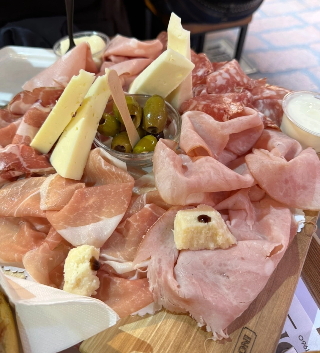 또한 광장 주변으로 수 많은 레스토랑과 와인바들을 찾을 수 있었다. 친구를 만나 광장 한바퀴 구경하고 나서 볼로냐에 온 이유 ‘맛집’으로 향했다. 볼로냐에 와서 꼭 먹어야 하는 음식이 있다. 볼로네제 스파게티도 물론 맛이 있지만 난 딸리에레(Tagliere)를 추천하고 싶다. 여러종류의 생 햄(프로슈토, 살라미 등)과 치즈를 한판 푸짐하게 담아주고 함께 곁들여 먹을 수 있게 빵과 잼, 스프레드도 함께 주는 음식이다. 이탈리아에서는 이 걸 식전에 먹는 안티파스토로 분류하고 있는데 사실상 이거 하나면 충분히 한끼 식사가 해결되는 양이다. 특히 레드 와인과 함께 먹으면 더할나위 없는 훌륭한 안주가 되기도 한다. 단돈 20유로에 사진과 같은 푸짐한 고기와 치즈들을 먹을 수 있어 강추드린다.