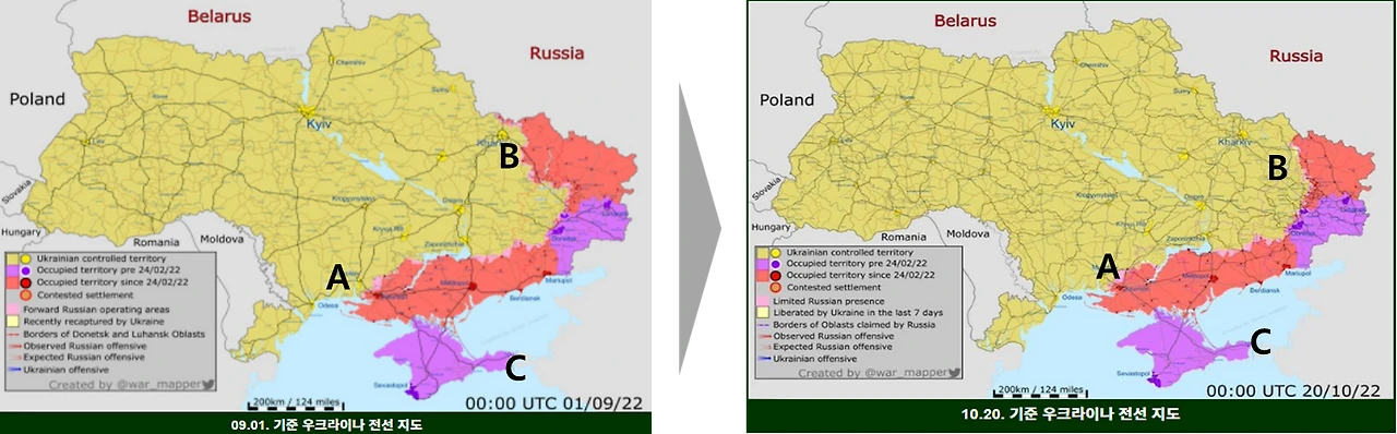 지난 9월 전쟁의 큰 변곡점이 있었습니다. 앞의 지도는 올해 9월 1일, 그리고 뒤의 지도는 10월 20일의 지도입니다. 약 2개월 사이 B부분에서 우크라이나가 러시아로부터 많은 영토를 회복했음을 알 수 있습니다.