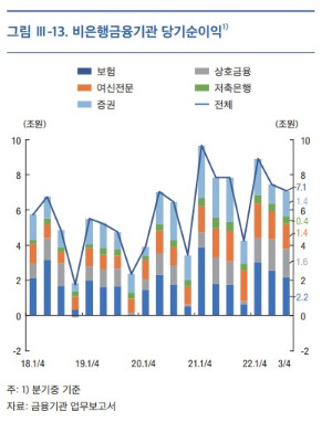 - 비은행금융기관의 수익성은 악화되고 있습니다. 증권사는 주식시장의 타격을 강하게 받았습니다. 대출금리가 상승한 것은 은행과 동일할 것이나, 아무래도 비은행금융기관의 조달금리 또한 은행보다 불리한 조건이라는 점이 수익성을 제한한 요인이 아닐까 하네요.