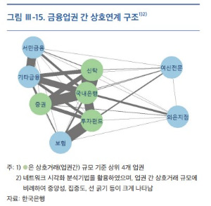 - 다음으로 볼 것은 금융기관 간의 상호거래 내역입니다. 금융기관끼리 거래가 빈번하고 넓게 엮여 있을수록 작은 Risk가 크게 확대될 가능성이 높을 것입니다. 그렇다고 이들 상호거래를 금지하는 것은 현재의 금융 system 자체를 부정하는 것이니 불가능합니다. 다만 a) 일부 금융기관의 부실이 다른 금융기관에 확산되는 위험인 부실전염 Risk와 b) 소수 거래상대방에 대한 의존도를 나타내는 집중도 Risk 검토 등을 통해 상호거래의 위험성을 관리하고, 문제를 사전 방지하는 것이 최선이겠지요.