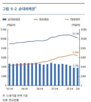- 금융기관에 한정된 내용은 아니지만 IMF의 아픈 기억이 있는 우리나라에 중요한 지표인 대외지급능력을 추가적으로 확인해 보도록 하겠습니다. 다행스럽게도 우리나라는 a) 해외에서 받을 돈(대외 채권)이 b) 해외에 줄 돈(대외 채무) 보다 많은 국가입니다. '22년 들어 그 폭이 축소되고 있는 것은 우려할 요인이지만 아직 당장 위험하다고 보기는 어려울 것 같습니다.