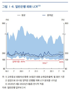- 외화 LCR은 2022년 10월 중 133.4%로 3월 (111.5%) 대비 21.9% 포인트 상승하였습니다. 이는 환율변동에 대비하여 은행들이 선제적으로 외화예금 등을 통해 유동성을 확보한 영향이 큽니다. 은행별로 보면 모든 은행들이 감독기준 (80%)을 상회한 것으로 나타났습니다.