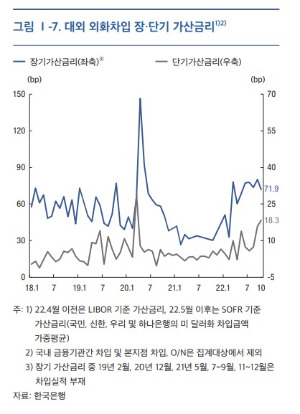 - 다만 글로벌 금리 인상 추세 및 경기침체 우려가 강해지다 보니 외화조달 여건은 점점 어려워지고 있습니다. 해외 외화차입 가산금리는 장, 단기 모두 상승 추세입니다. 이 부분은 장기적으로 은행의 비용 상승으로 복원력을 제한할 것 같습니다. 각종 메크로 우려가 빨리 완화되는 것이 중요하겠지요.