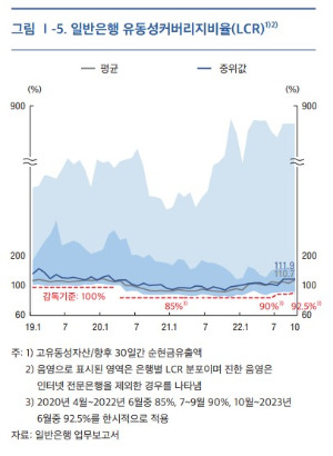 - 다만 은행들이 LCR비율 규제 복귀에 대비하여 LCR비율을 공격적으로 확대한 결과, '22년 9월 레고랜드 사태 때 한전과 같이 자본시장의 블랙홀 역할을 한 적이 있습니다. 또한 유동성 확보를 위해 정기예금을 경쟁적으로 유치하니 금리 인상의 효과에 더불어 예금 금리가 급상승했고, 그에 따라 대출 금리가 급상승하게 되었지요. 결국 2022년 10월 이후 금융시장 안정을 위해 은행의 LCR 규제비율을 2022년 10월~2023년 6월 중 92.5%로 유지하기로 결정하였습니다.