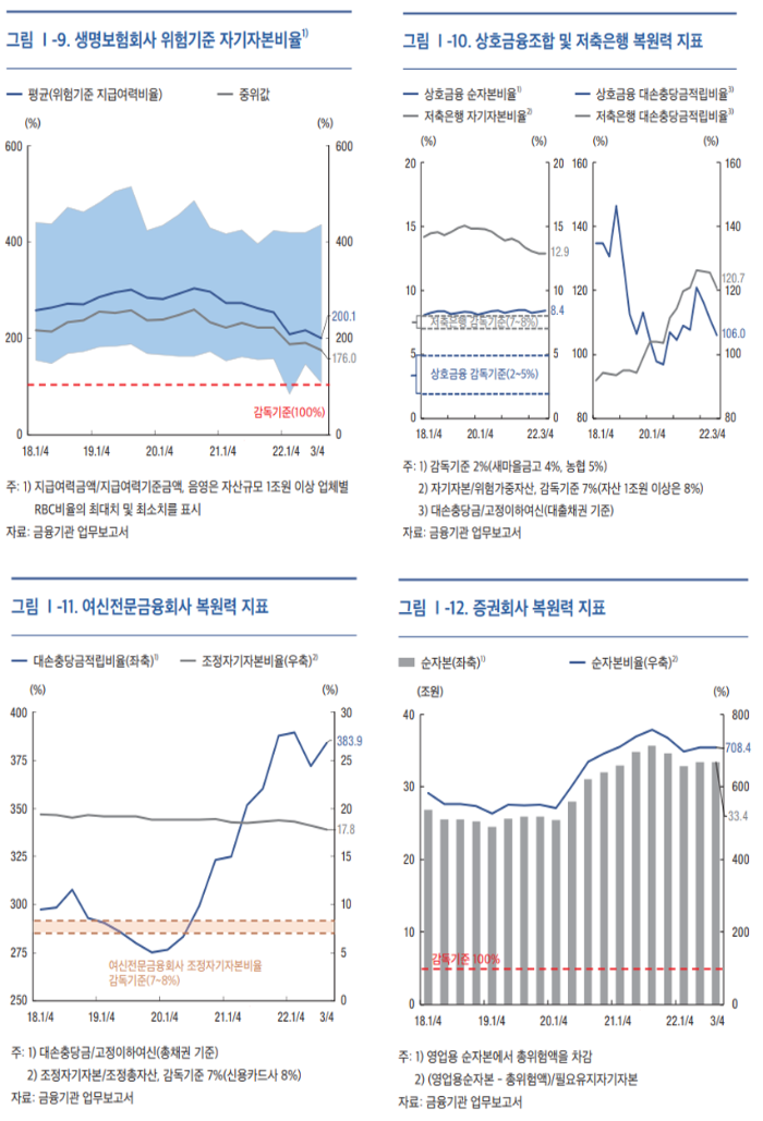 - 글의 서두에서 언급한 바와 같이 비은행금융기관 복원력은 대부분의 업권에서 자본비율이 감독기준을 상회하는 등 대체로 양호한 수준이나, 증권회사, 여신전문금융회사 및 저축은행의 경우 유동성 리스크가 다소 높아진 모습입니다. 한국은행 또한 주식, 부동산 등 자산시장 부진이 지속되고 있어 동 업권의 유동성 리스크가 재차 촉발될 수 있는 상황으로 보고 있습니다.