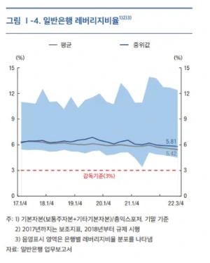 여하튼 일반은행의 각종 자본비율은 강화된 국제기준을 적용하더라도 기준을 크게 상회하고 있습니다. 또한 일반은행의 레버리지비율 역시 (그놈의 바젤3 기준인 3%를 충분히 상회하는 수준입니다.