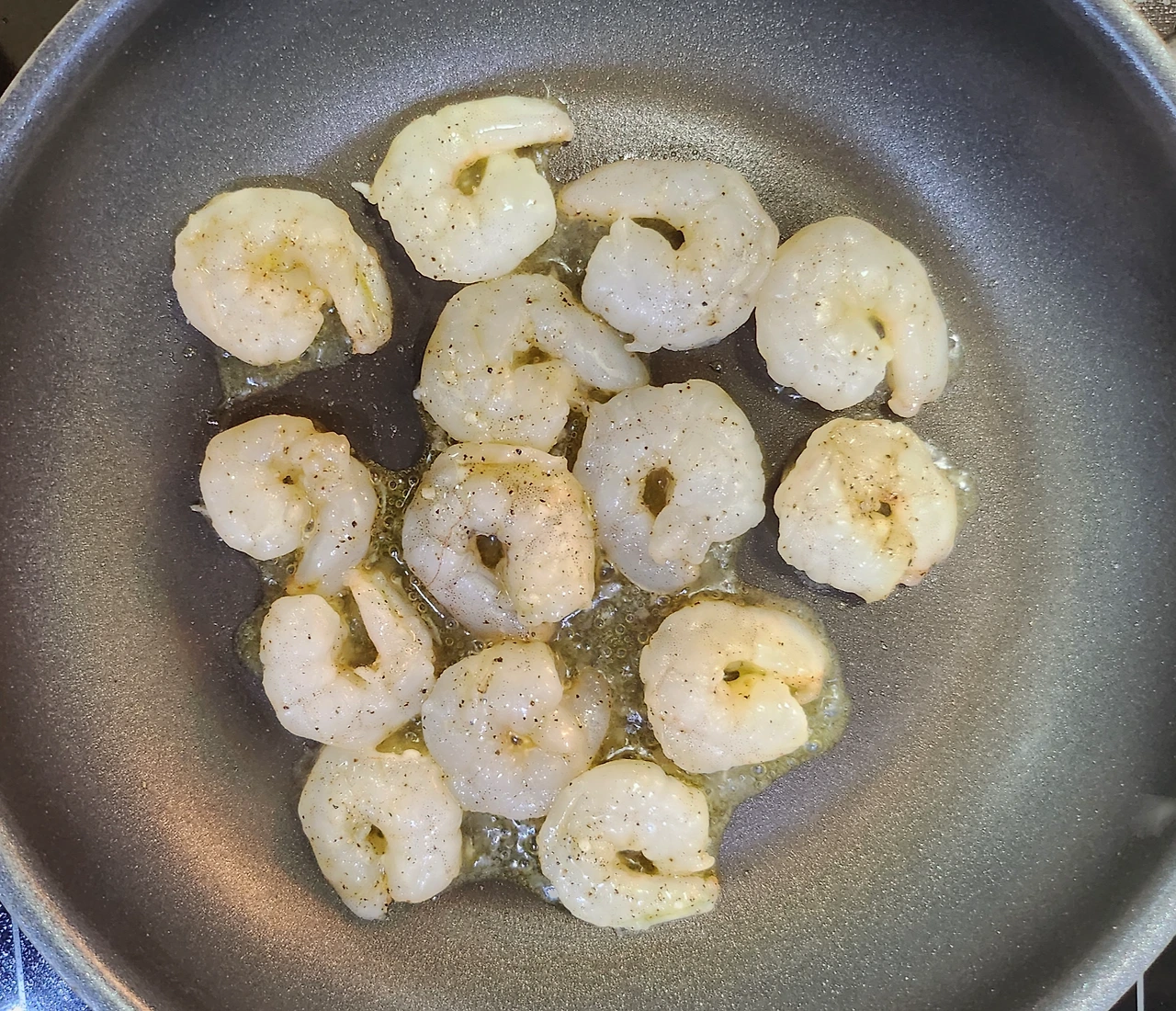 재워 두었던 새우를 팬에 굽는다.