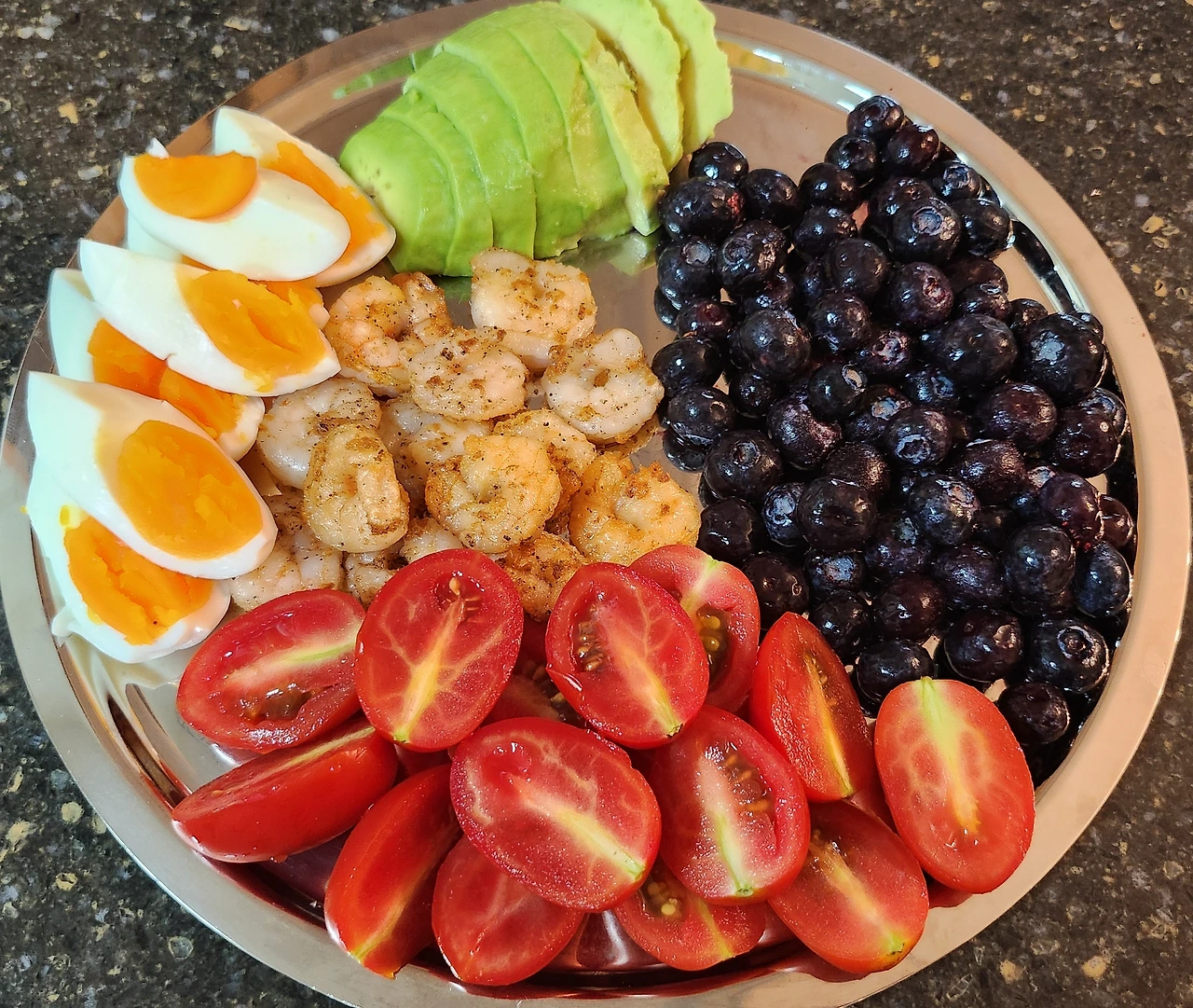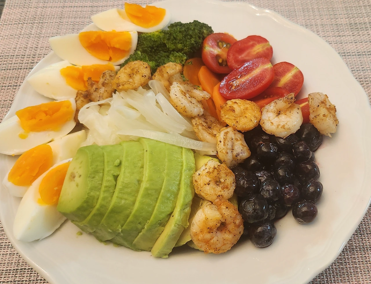 재료: 양배추, 양파, 당근, 브로콜리, 블루베리, 아보카드 1/2개, 계란 2개, 방울토마토 7개, 새우 15마리( 새우 대신 닭 가슴살, 샤부샤부용 쇠고기를 사용하기도 합니다.), 소금 1Ts, 후추 조금
