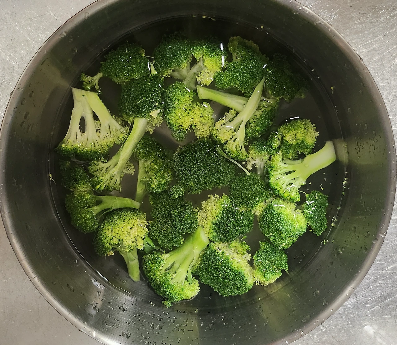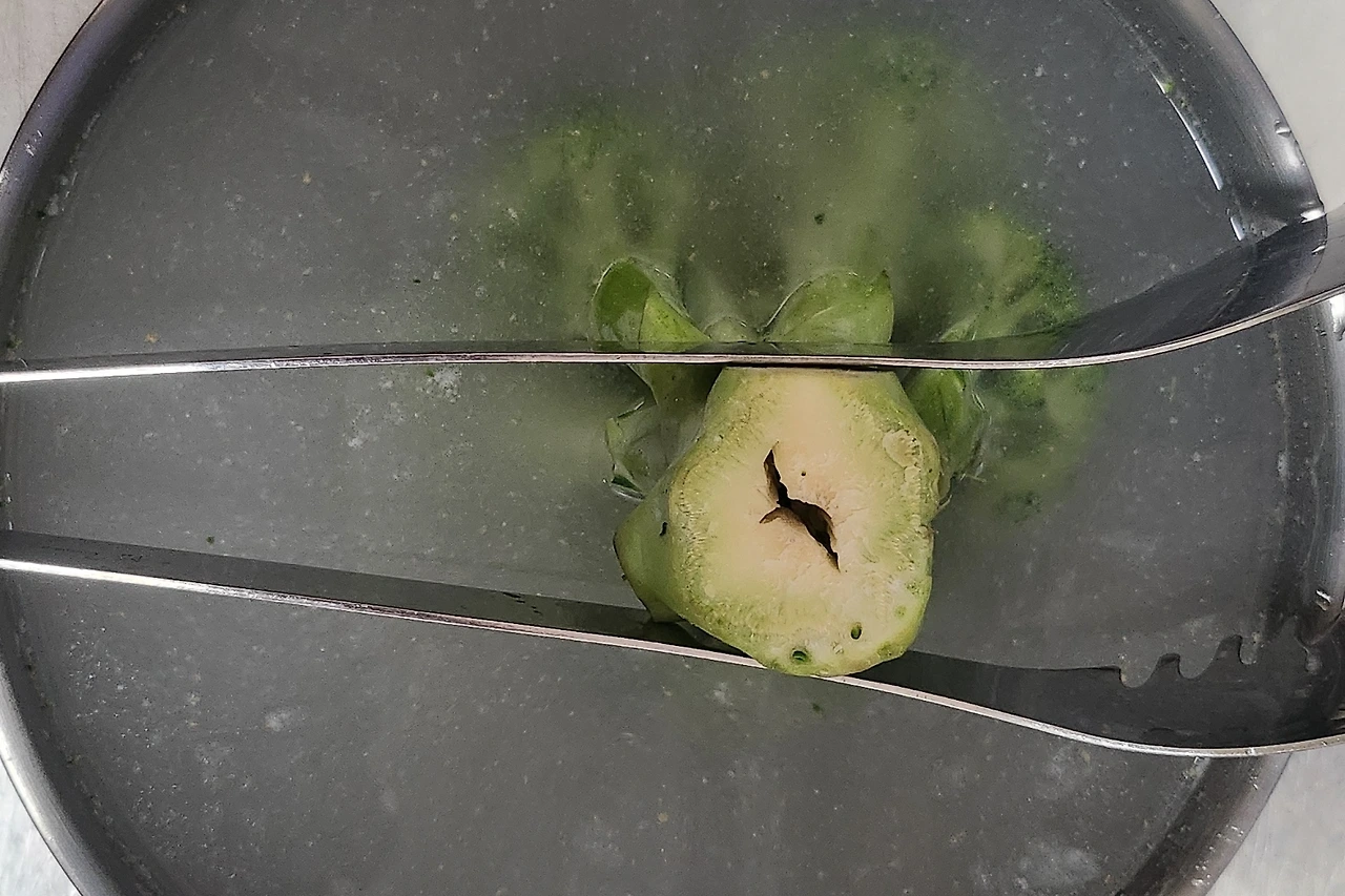 브로콜리는 촘촘한 구조와 왁스 코팅, 잔류 농약, 벌레 등으로 인해 흐르는 물만으로는 세척이 충분하지 않은므로, 넓은 볼에 밀가루 1Ts과 소금 1Ts을 넣고 사진과 같은 방향으로 브로콜리를 고정하여 10분 이상 담가 둔다.