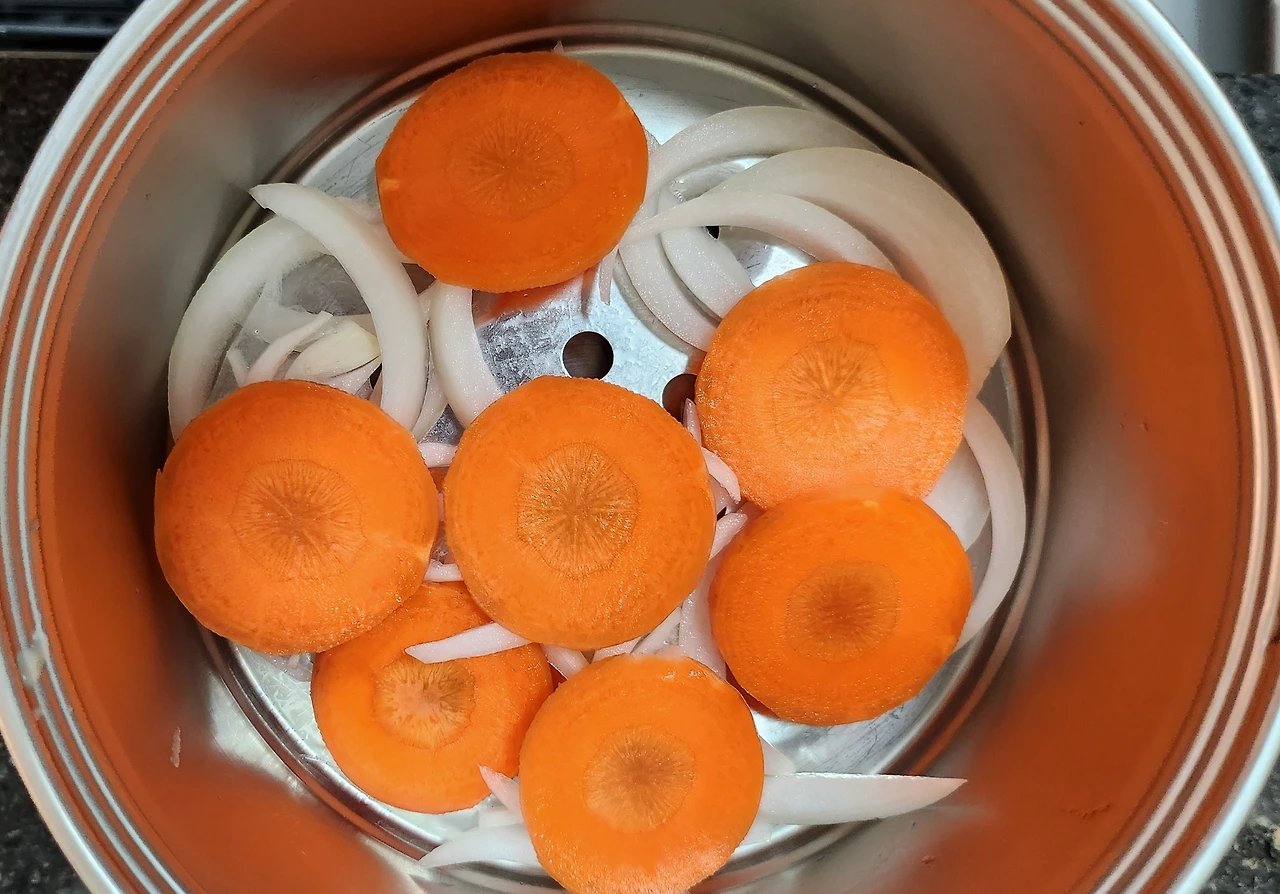 찜기에 준비된 야채를 켜켜이 올린다. 단단한 것을 아래에 둔다.