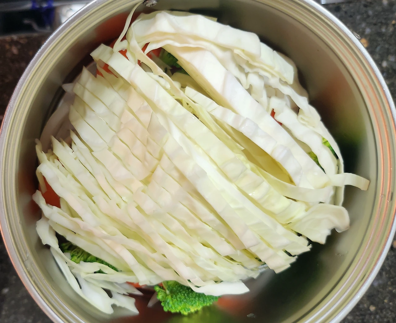 야채가 다 쩌지면, 양배추를 아래에 깔아 두고 나머지 재료를 보기 좋게 올린다.