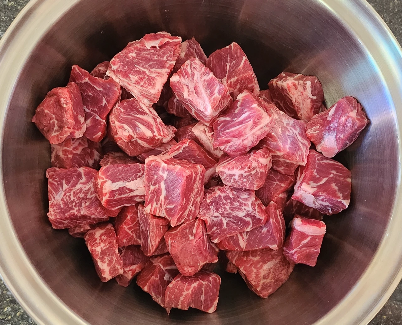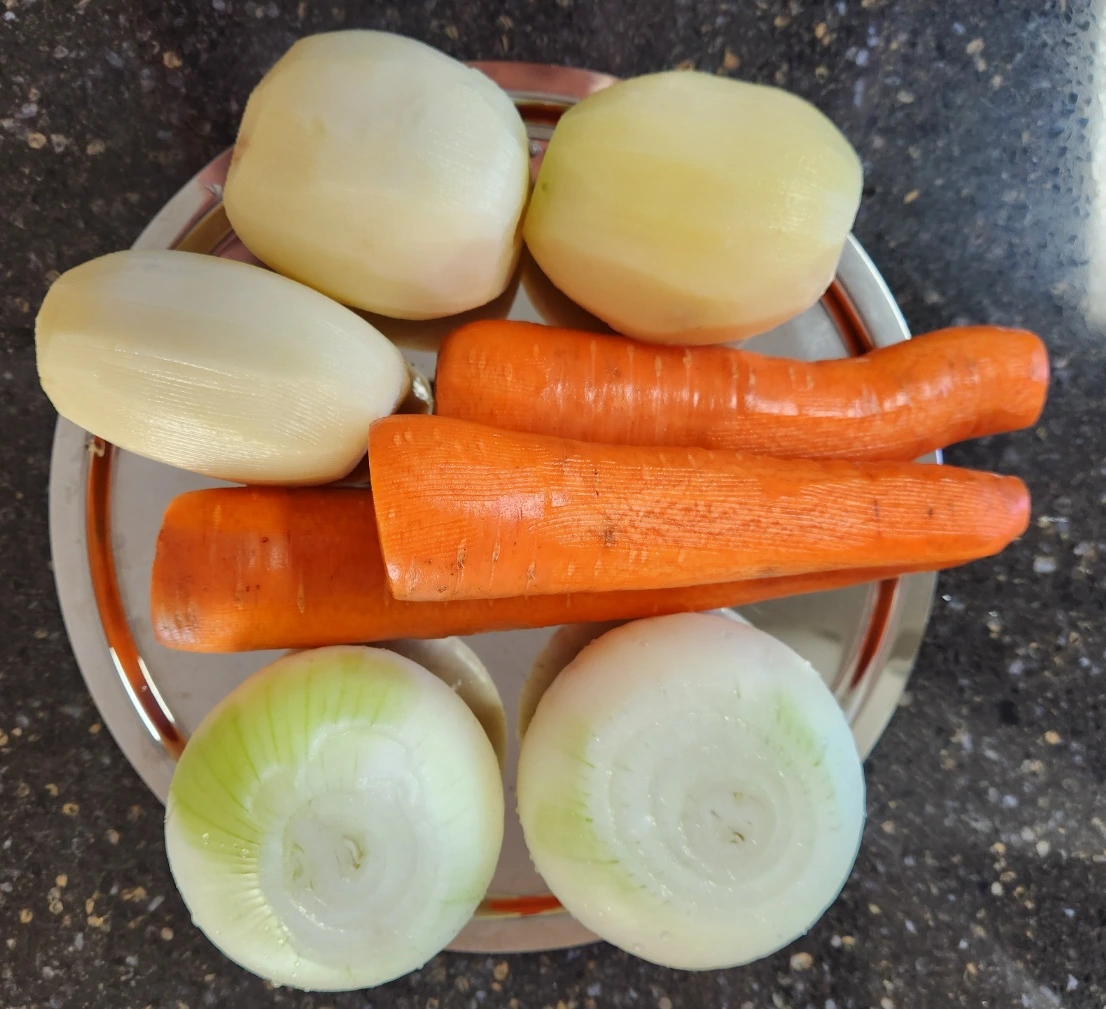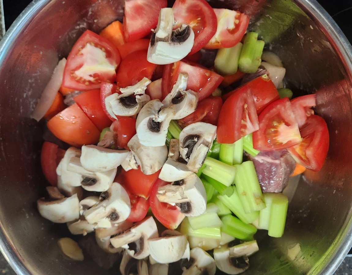 소고기 2.5kg, 양파 2개, 감자 3개, 당근 3개, 셀러리 1대, 토마토 3개, 양송이버섯 6개, 큰 마늘 5개,