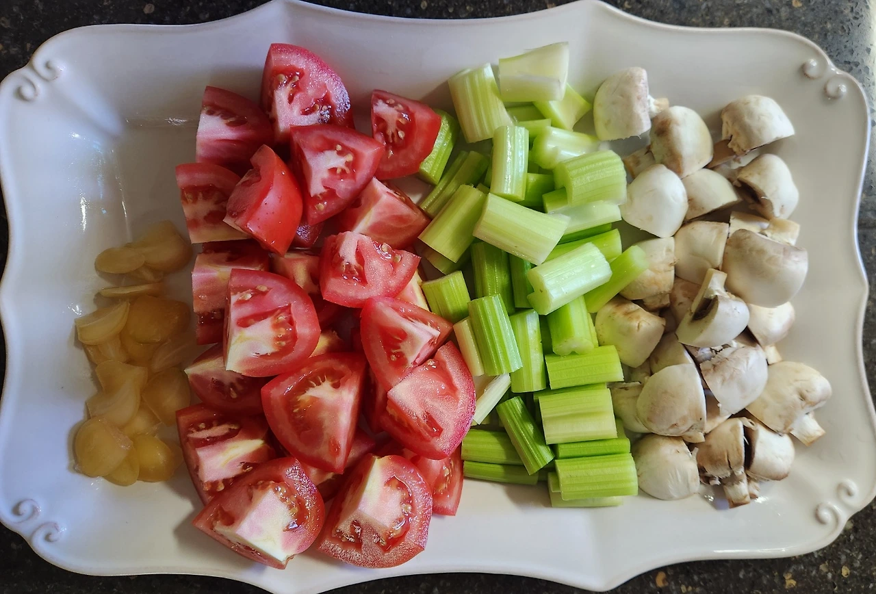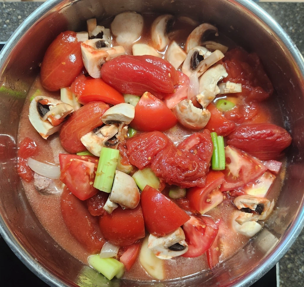 셀러리, 토마토, 양송이버섯, 마늘을 굵직하게 썬다.