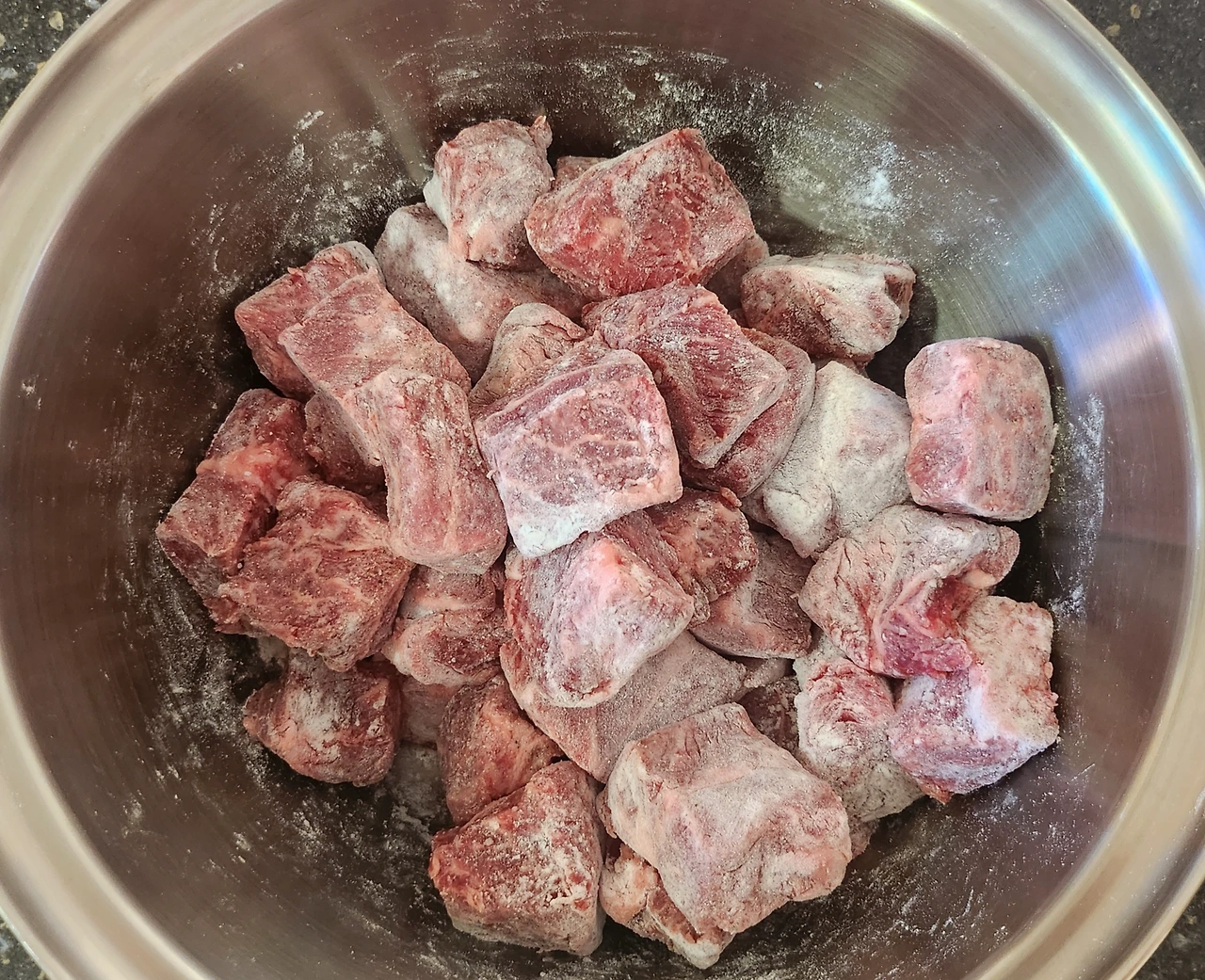 소금, 후추로 간을 한 소고기에 밀가루를 입힌다.