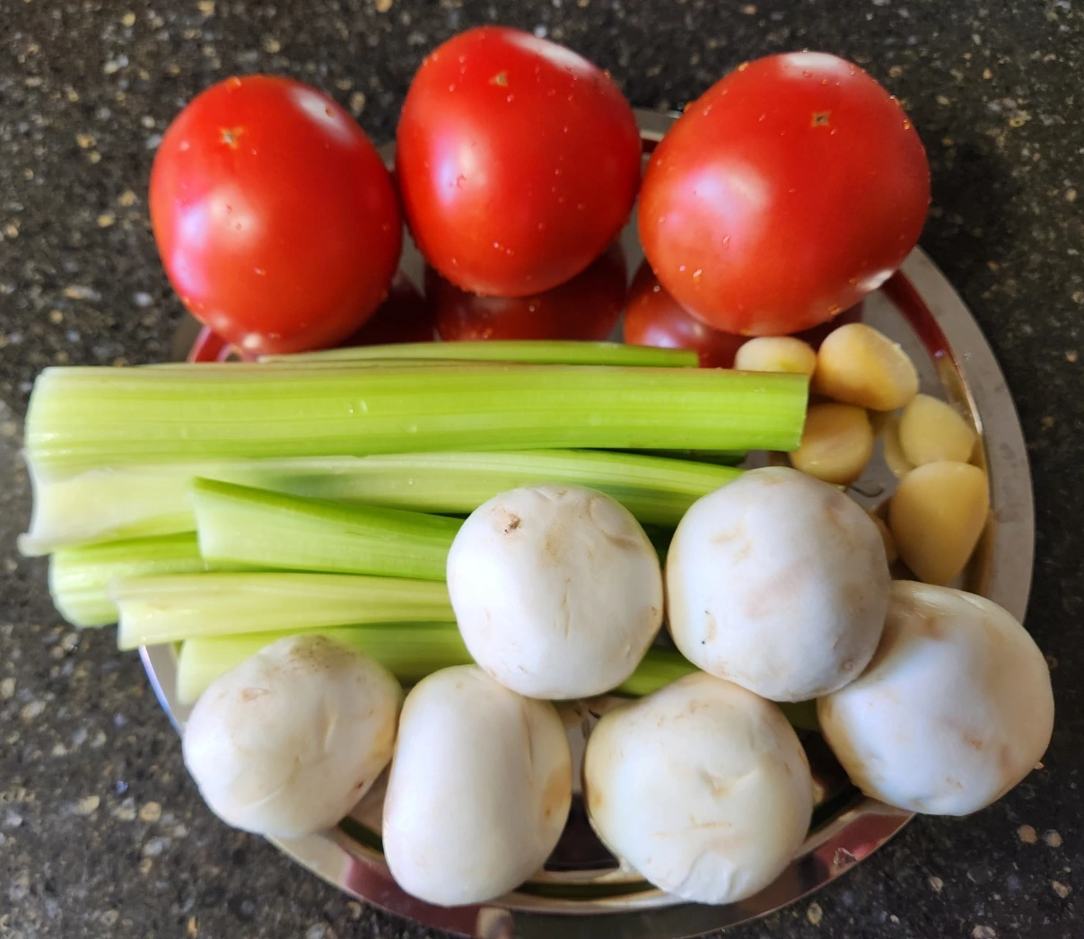 셀러리, 토마토, 양송이버섯, 마늘을 준비한다.