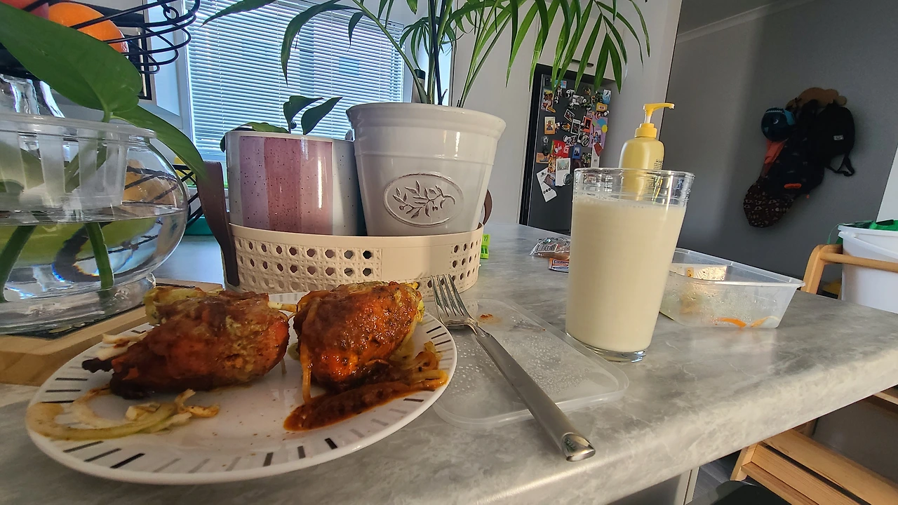 먹다남기고 집으로 싸가지고 온 탄두리치킨(향신료의 풍미가 강하게 느껴지는 인도식 닭 요리다)