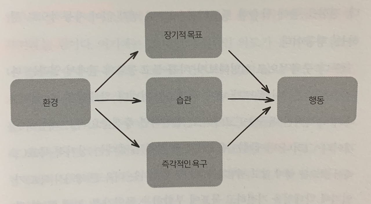 인간이 처한 환경은 행동을 자극하는 가장 기본적이고도 확실한 토대를 마련한다. 특정한 환경에 놓인 우리는 장기적 목표, 습관, 그리고 즉각적인 욕망이라는 세 가지 필터 중 하나를 거쳐 행위로 나타난다는 것이다.