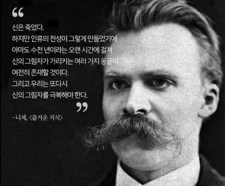 니체는 <짜라투스투라는 이렇게 말했다>의 저자로 유명하고 또, "신은 죽었다"라는 말로도 수많은 젊은이들의 마음을 흔들었다. 학교 화장실마다 기억 나는낙서, “신은 죽었다 -> 그러는 니체도 죽었다”