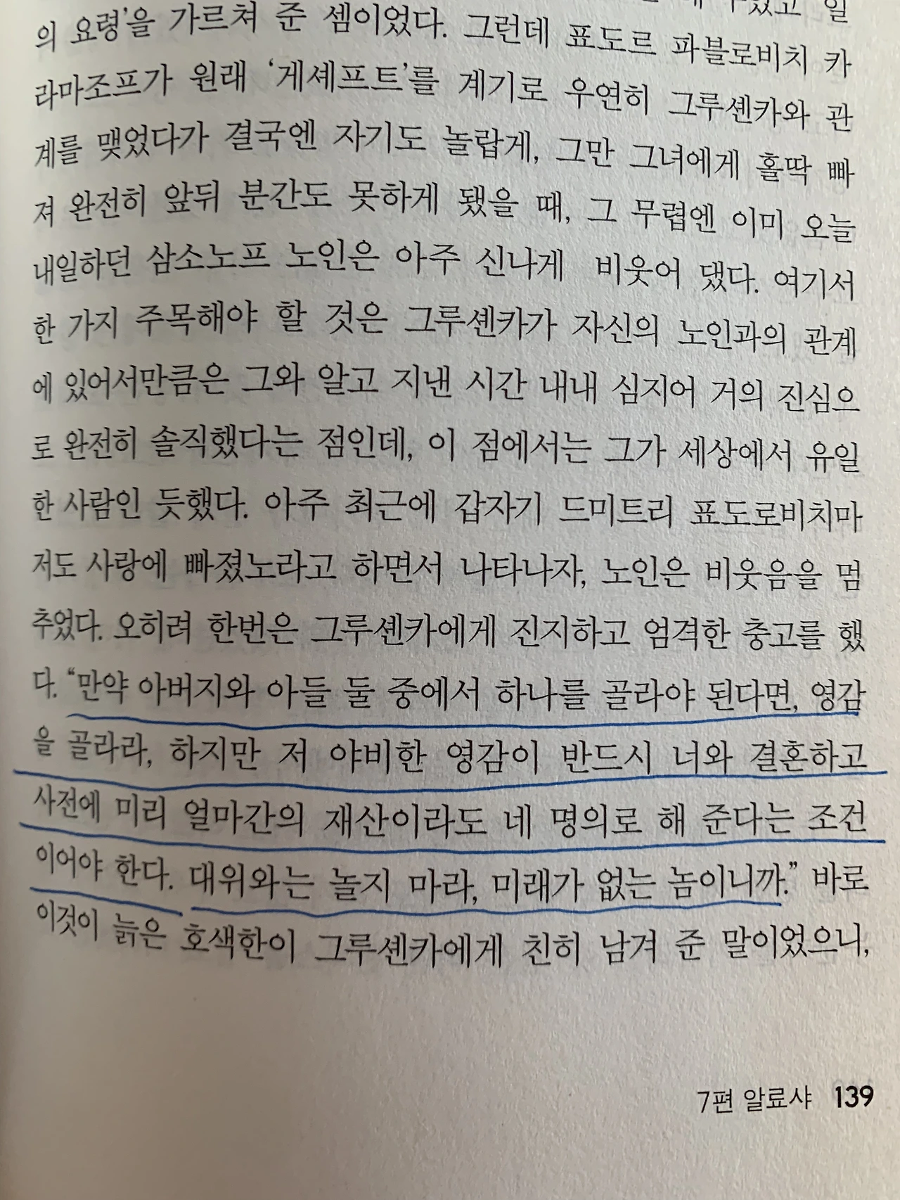 그루셴카의 후견인 노릇을 해온 거상, 삼소노프는 그루셴카에게 충고했다. 아들, 드미트리보다는 아버지 파블로비치를 선택하는 편이 나을 거라고 말이다. 단, 파블로비치를 선택하면서 반드시 그의 재산 일부를 그루셴카에게 양도한다는 각서를 받으라는 언질을 잊지 않는다. 삼소노프의 충고는 맞기도 하고 틀리기도 하다. 관점을 어떻게 하느냐에 따라 미래가 없는 놈은 영혼이 맑은 사람으로 보일 수도 있으니 말이다.