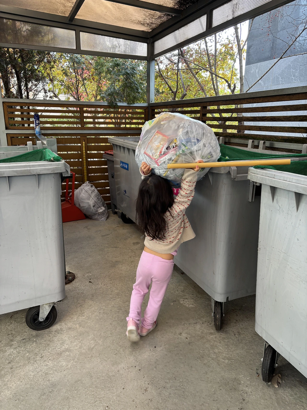 허리 아픈 엄마를 대신해서 분리수거에 나선다.