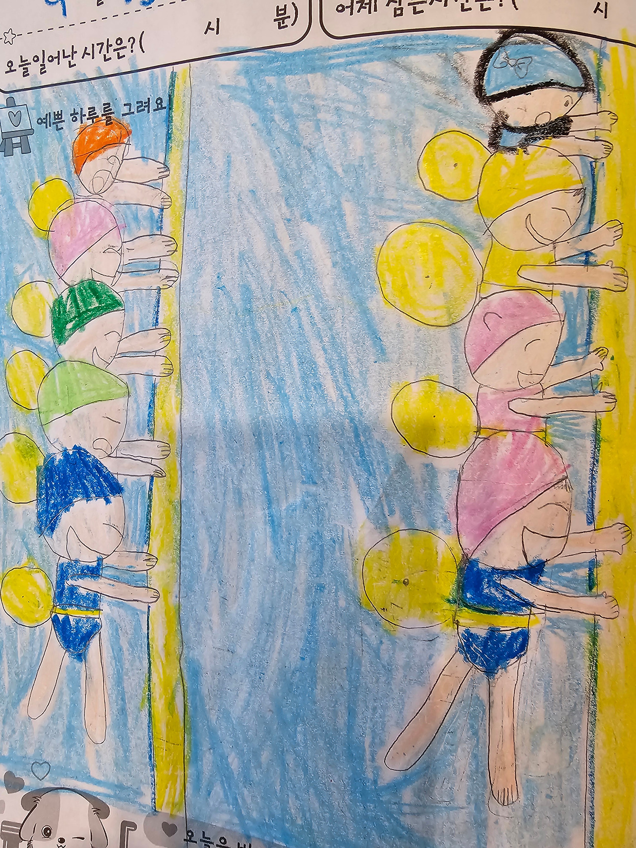 그런데 수영을 다 하고 수영 선생님들이 1명씩 우리 머리를 대충 감겨 주셨다. 그래서 머리를 혼자 묶었다.