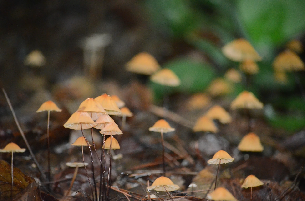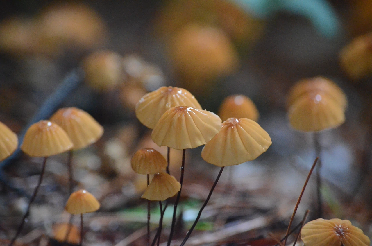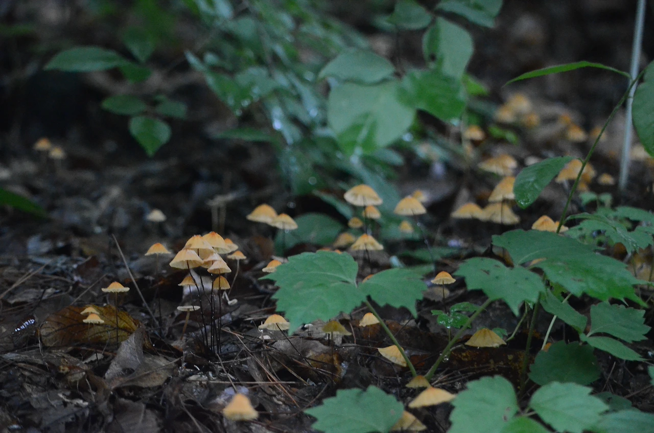 버섯갓 지름 1~2㎝, 종모양 또는 둥근 산 모양, 활엽수 낙엽 위에 무리를 지어 자라난다.