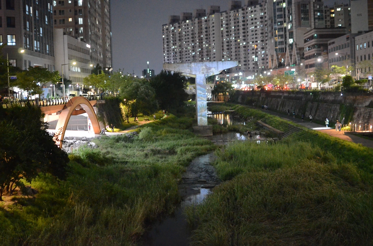 청계고가를 기억할 수 있도록 남긴 교각 3개는 정릉천 진입로 근처에 있다. 교각 2개는 바닷속과 물고기를 그린 벽화에 조명을 비추어 콘크리트 느낌을 지우려 했다.
