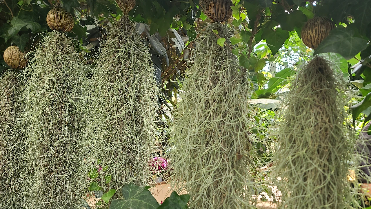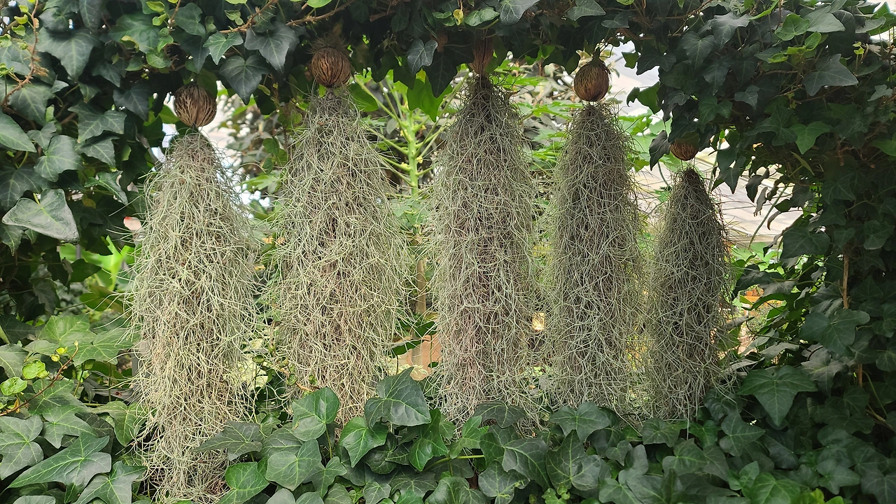 흙 없이 공중에서 키우는 에어플랜트로 건조할 때는 회색, 젖어있을 때는 밝은 초록색으로 남보라색 꽃이 차례로 피는데 같은 포에서 3~4장의 꽃잎을 올린다.