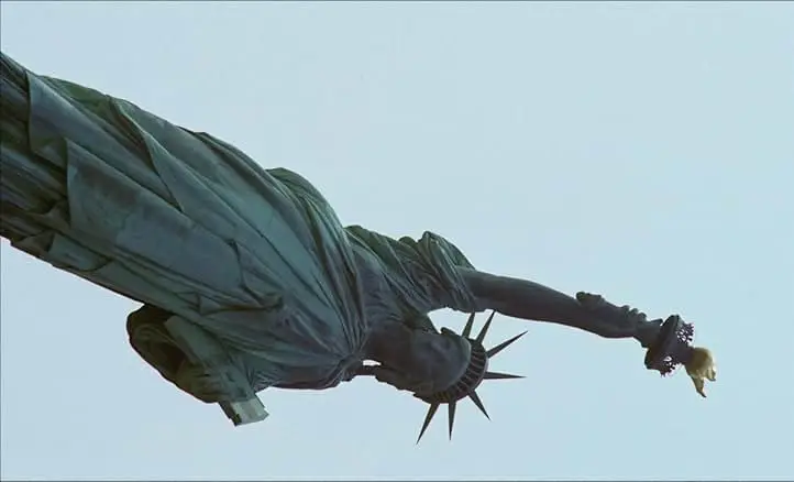 화면이 전환되고 어두컴컴한 화면이 이어집니다. 간간히 새어들어오는 창문의 빛. 남자는 불안하게 어딘가를 향해 걸어갑니다. 문이 열리고 화면에 환한 빛으로 가득합니다. 어딜까요, 미국입니다. 자유의 여신상이 보이거든요. 그런데 카메라는 자유의 여신상을 거꾸로 담고 있습니다. 왜 일까요?
