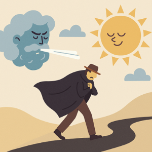 바람과 해는 나그네의 외투를 벗기는 경쟁을 했다. 바람은 강하게 불어 외투를 벗기려고 했지만 나그네는 오히려 더 단단히 외투를 붙잡았고, 이어 해가 따뜻한 온기를 계속 내리자 더위를 느끼고 외투를 벗었다.