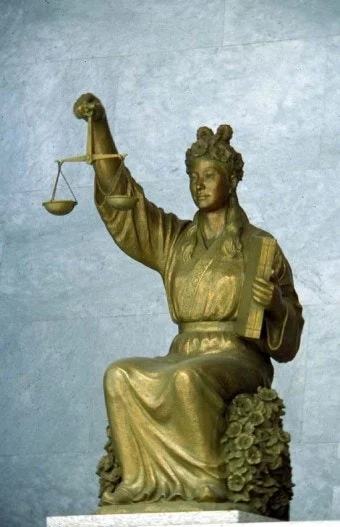 대한민국 대법원 로비 벽에도 여지없이 디케의 상을 만날 수 있는데, 단호한 위엄이라곤 조금도 찾을 수 없는 곱상한 새댁 같은 얼굴에, 준엄한 '검'이 아닌 '법전'을 끼고 단아하게 앉아있는 모습이다.