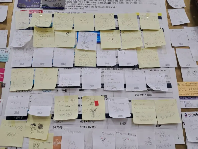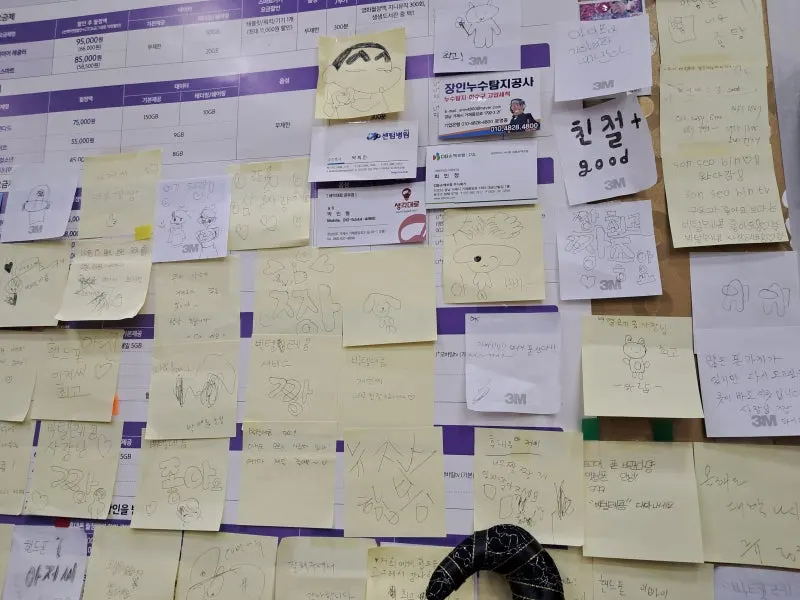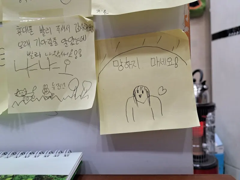 친절한 젊은 사장님을 응원하는 많은 낚서 메모 중에, 눈길을 일거에 사로잡은 명령 하나.