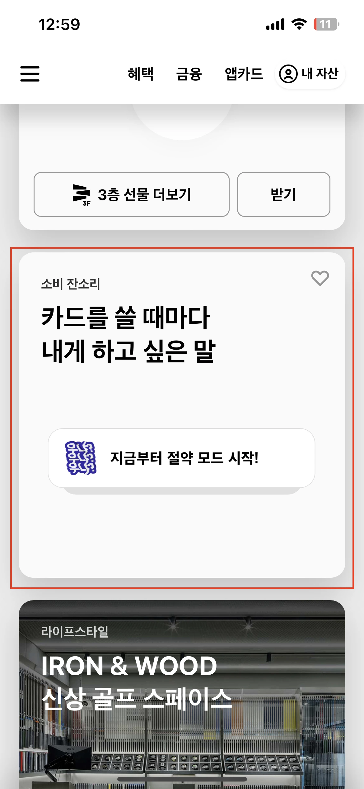 메뉴 옆 new 문구 표시를 통해 사용자가 새로운 기능에 대해 관심을 갖도록 했다. 나 또한 new 강조 표시를 보고선 스크롤을 멈추고 일반적으로 쓰지 않는 ‘소비 잔소리’ 단어를 보고 궁금증이 생겨서 들어갔다.