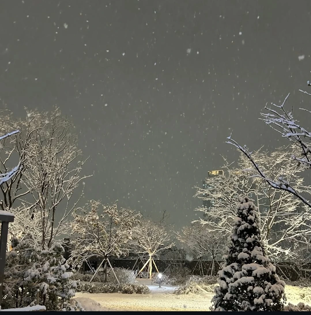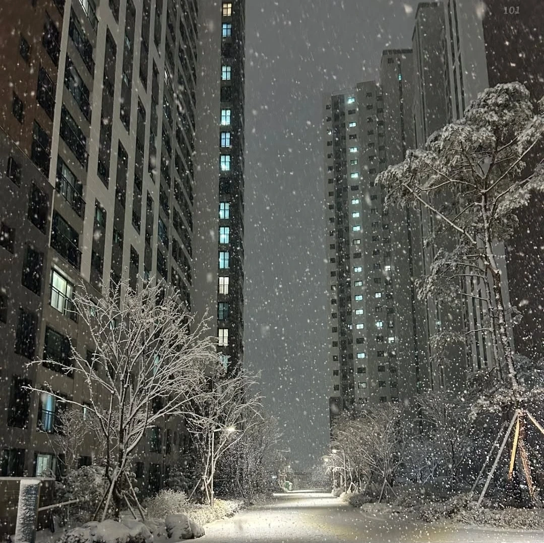-올해 초 폭설이 왔을 때 분양받은 아파트 조경이 너무나 멋졌다. 등원 불가로 연차였다.