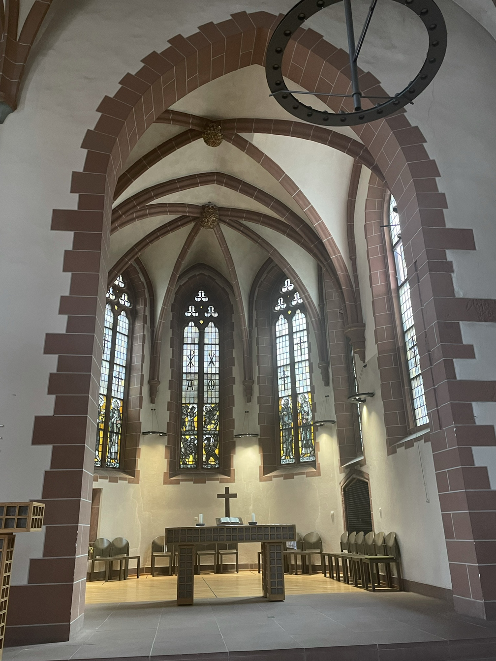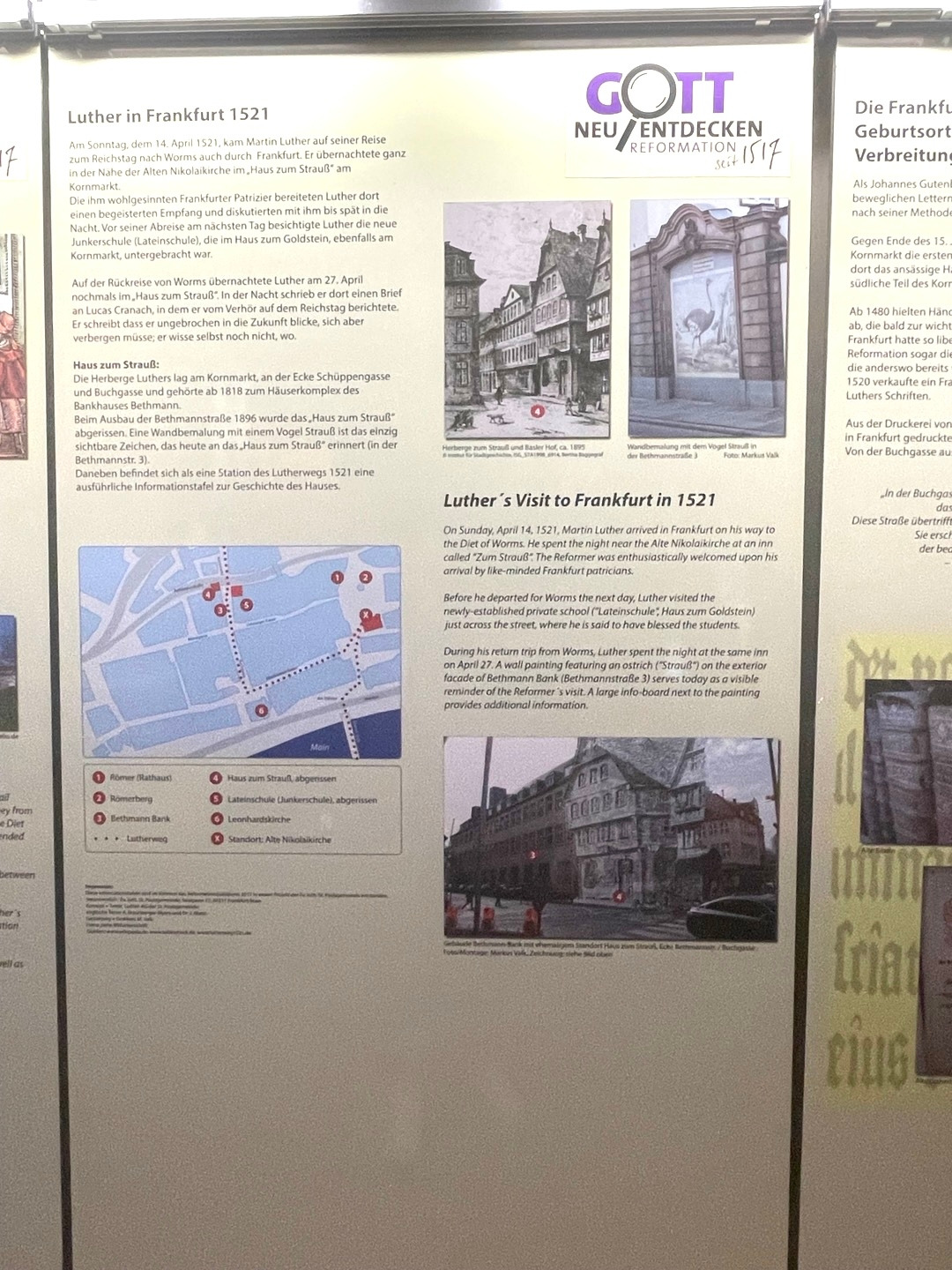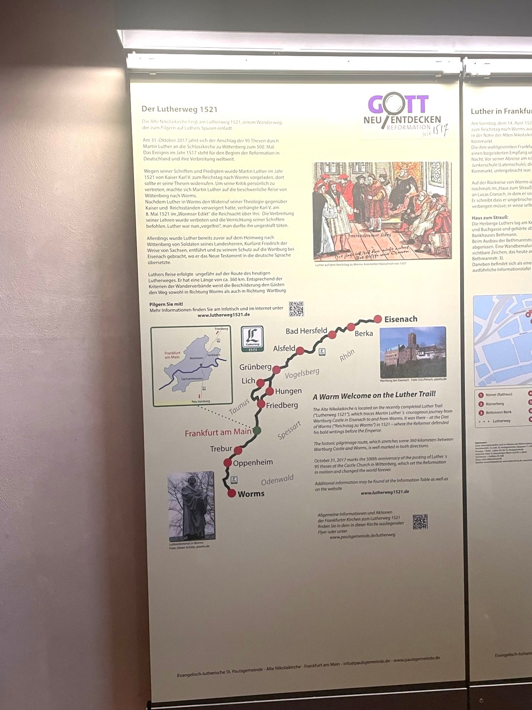 뢰머광장의 옛시청 건물과 대각선 방향에 있는 성 니콜라이 교회로 갔다. 이 교회는 고딕양식으로 지어진 크지 않은 교회지만 왕실교회였다. 원래는 로마카톨릭 교회였으나 종교개혁 후인 1530년부터 미사가 중단되고 교회서적 등의 보관창고로 사용되어 오다가 다시 1721년에 가서야 개신교 교회가 되었다. 1517년 마르틴 루터(Martin Luther)는 종교개혁의 기치를 내걸고 95조의 논제를 비텐베르크 성채교회당 ((Schlosskirche zu Wittenberg) 문에 발표를 하고나서 로마교황청으로부터 파문을 당하였다. 1521년에 신성로마제국 황제 칼 5세는 루터에게 소명의 기회를 주려고 보름스 의회에 루터를 소환했고 루터는 의회에 참석하기 위해 아이제나흐에서 보름스까지 가는 길 중간에 있는 프랑크푸르트에 1521년 4월 14일에 도착했다. 그때 이 성니콜라이 교회 바로 근처의 여관( Haus zum Strauss) 에서 잤음을 기념해서 <루터의 순례길>(Der Lutherweg 1521) 을 만들고 매년 순례자들을 모집해서 360km에 달하는 순례행사를 갖는다. 바르트부르크 성에서 보름스까지 오고 가는 순례길에 대한 자세한 안내가 성 니콜라이교회 게시판에 붙어 있어서 보게 되었다. 루터는 종교적 •사회적 관점에서 보면 마녀사냥과 면죄부판매가 횡행했던 중세시대를 끝장내고 새로운 근대를 열어제친 위대한 인간이다. 누가 그 당시에 감히 교황의 권위에 도전하고 세속황제의 명을 거부할 생각을 했을까? 불합리한 교리에 등불을 비춰 무지몽매한 인간들을 계몽하려 했던 그의 행위는 휴머니즘의 관점에서도 눈물겨운 일이다. 그의 생애를 묵상하며 그의 발자취를 따라가 보는 것도 의미있는 일이 되리라 생각했다.