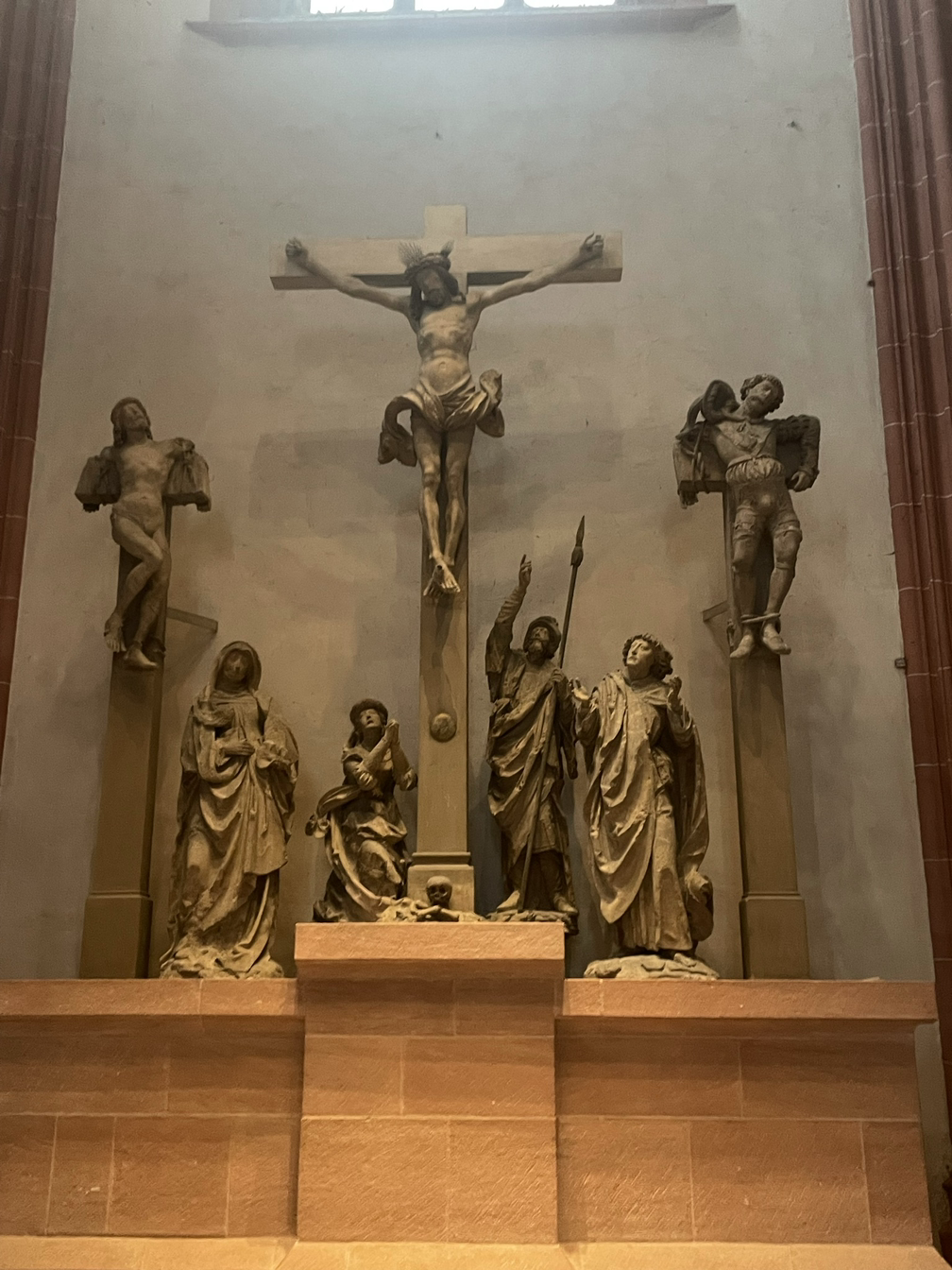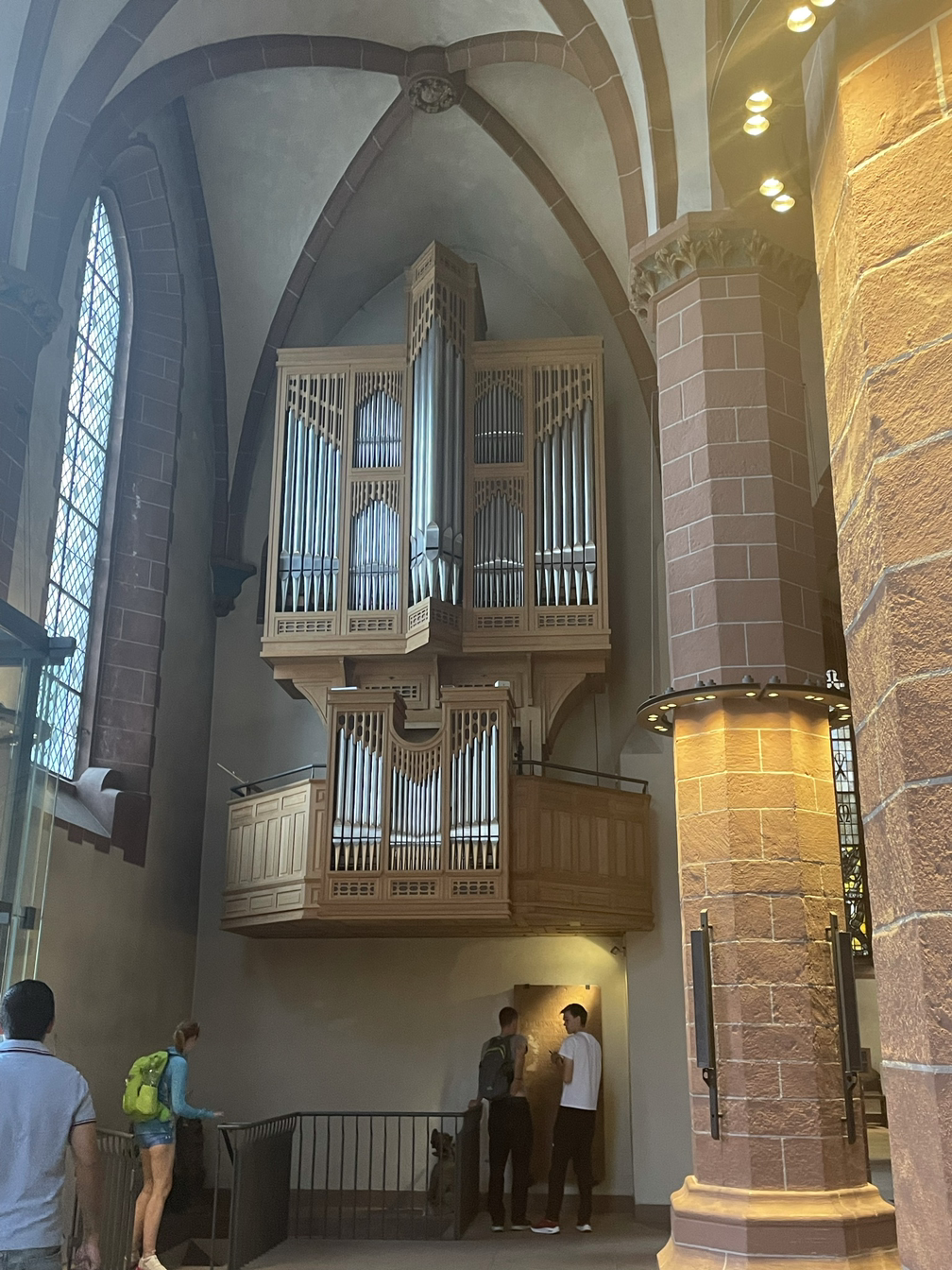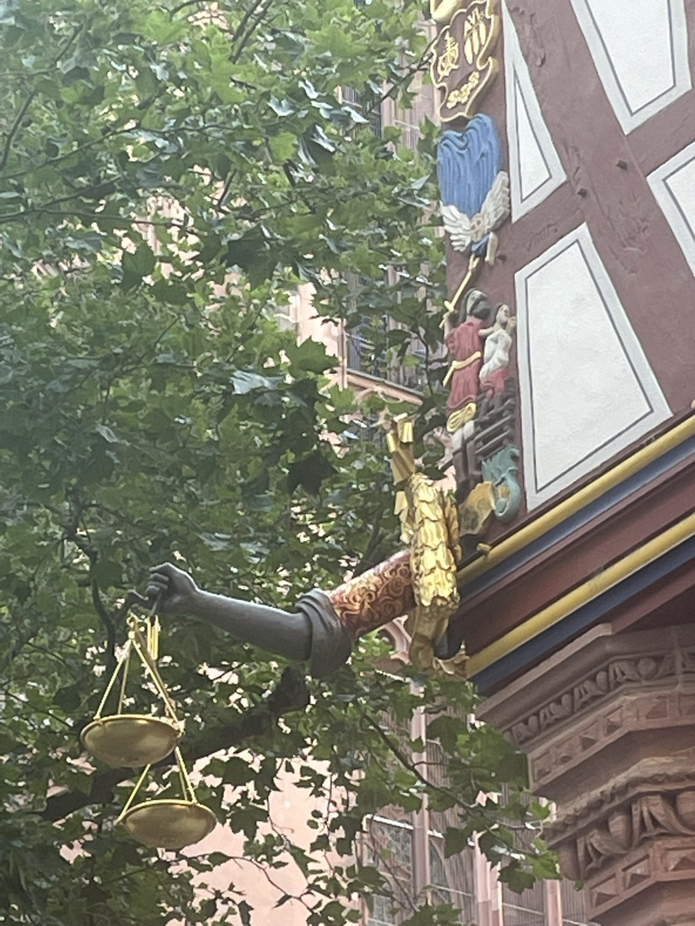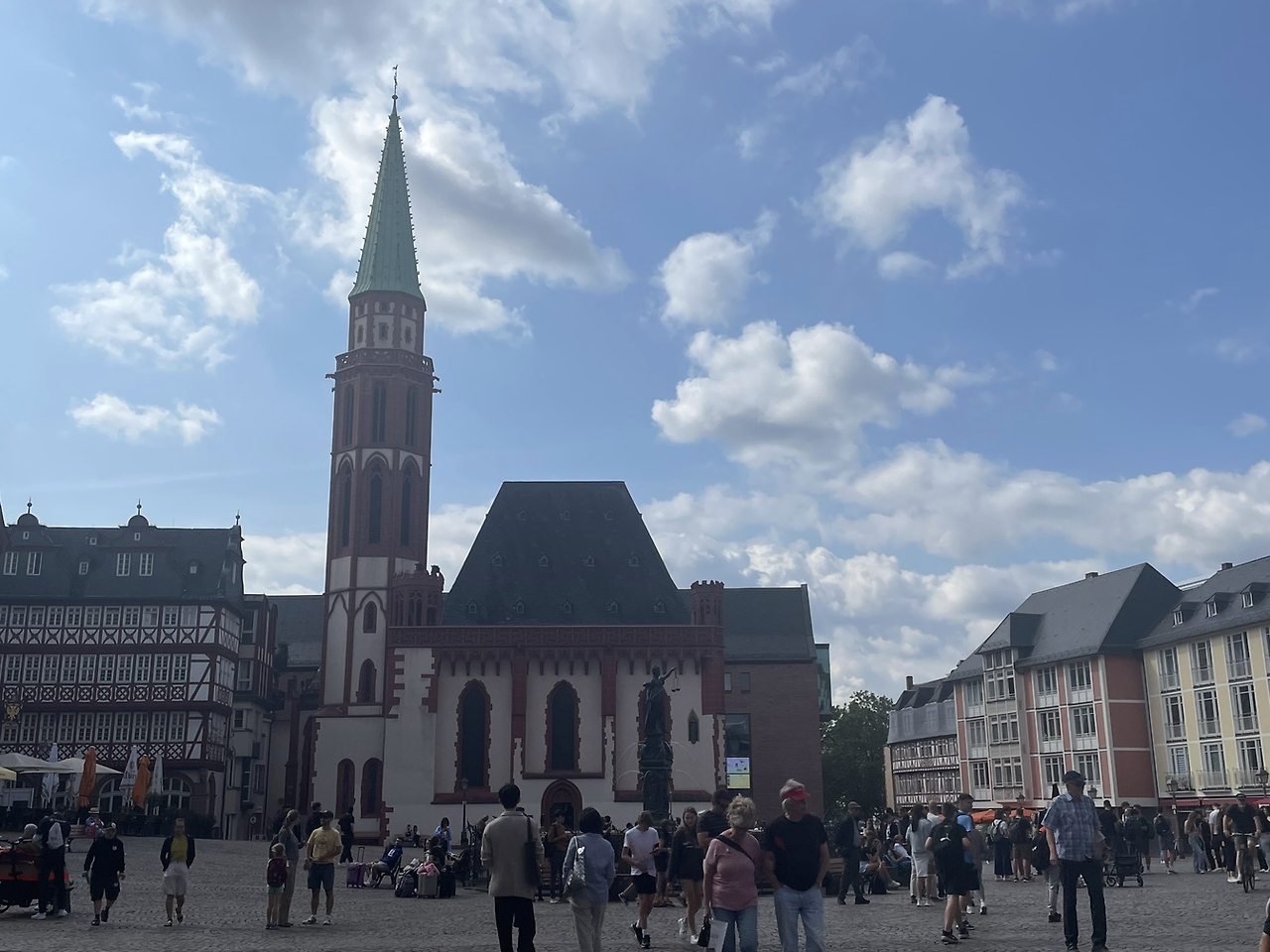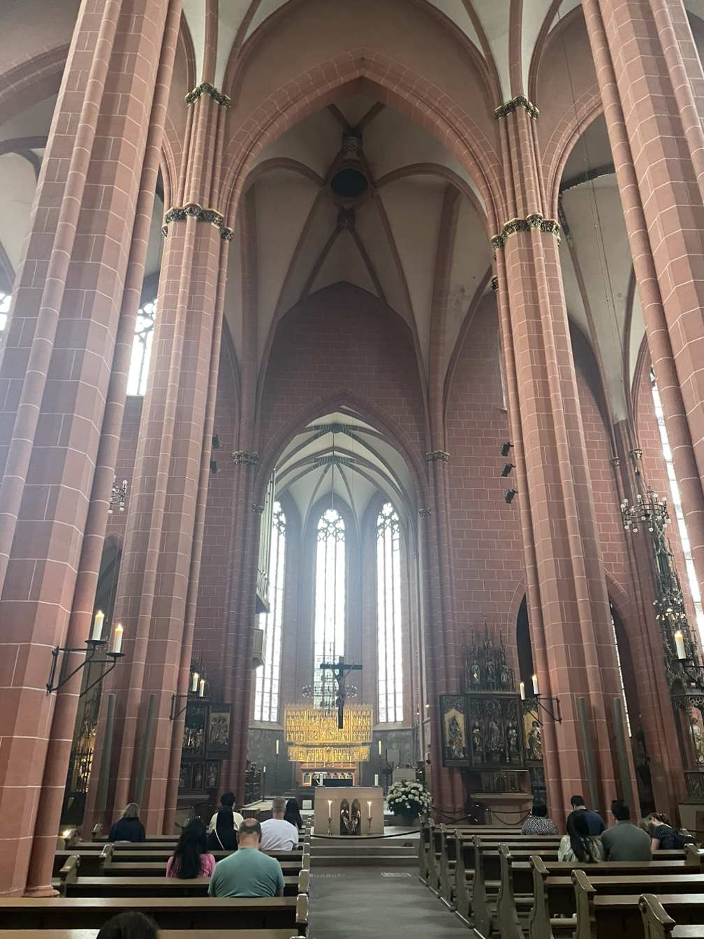지하철을 타고 다시 뢰머광장으로 가서 저번에 들렸던 카페에 가서 차와 케익을 먹고 다리를 쉬었다. 카페의 상호가 <황금저울>이어서 건물 지붕 모서리에 예쁘게 장식으로 달아놓은 저울 모양을 이번에는 신경을 써서 예쁘게 찍어봤다. 이 카페에는 여전히 손님들이 가득이다. 돈을 도대체 얼마나 많이 벌고 있을까 잠시 부러운 마음도 들었다. 한 시간 정도 지나서 바로 그옆에 있는 프랑크푸르트 대성당에 다시 한번 들어가 보았다. 성당 내부가 아주 화려한 편은 아니고 정갈하고 소박했다. 여기서 옛날에 1562년부터 1792년까지 신성로마제국의 황제 대관식이 열렸다고 하는데 그런 점에서 성당 내부가 대단히 화려하고 멋있게 장식돼있고 뭔가 멋진 것이 있으리라고 기대했다면 큰 착각이다. 여기에서도 독일인들의 검소하고 겸손한 태도를 잘 확인할 수 있다. 외양의 화려함 보다는 역사적 상징성과 의미가 더 중요하다는 사실에 방점을 찍는다.